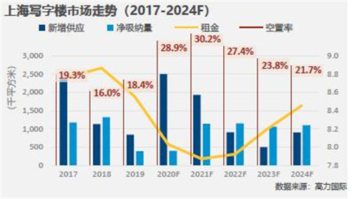 高力國際調(diào)研季報顯示,2020年第一季度上海寫字樓租賃市場凈吸納量整體處于低位。機構(gòu)預判上海寫字樓空置率將從2019年的18.4%升至2020年的28.9%,2021年空置率將達30.2%的巔峰。