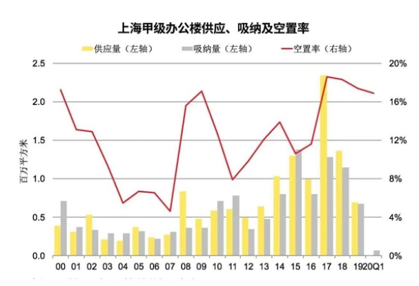 事實(shí)上,上海寫字樓市場整體空置率更甚于甲級市場。據(jù)高力國際最新統(tǒng)計(jì),一季度上海寫字樓整體空置率為19.2%,環(huán)比下降0.8個百分點(diǎn),但這一空置率將在2020年末達(dá)到28.9%。