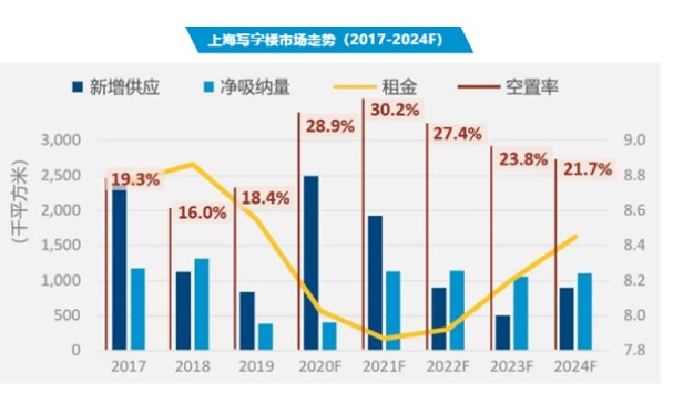 據(jù)第一太平戴維斯數(shù)據(jù),一季度上海甲級寫字樓租金環(huán)比加速下跌1.0%至7.8元/平方米·天。同時,高力國際數(shù)據(jù)顯示,2020年全年上海寫字樓整體租金將下降6%,并且在一段時間內(nèi)維持低位,2022年才望回復(fù)上漲。