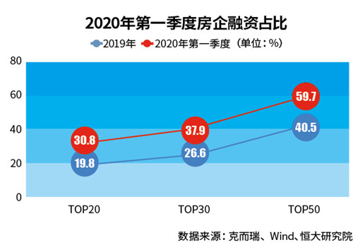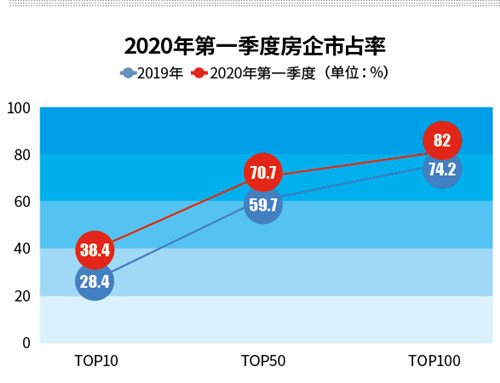 從行業(yè)集中度看,兩級分化格局正不斷加劇。來自恒大研究院數(shù)據(jù)顯示,2019年,前10強、前50強、前100強房企市占率分別高達28.4%、59.7%和74.2%。到了2020年一季度,上述房企市占率分別較2019年再提升10.0、11.0和7.8個百分點。