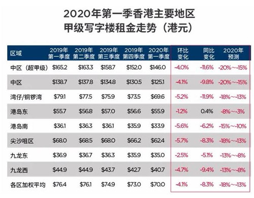 據(jù)戴德梁行分析報(bào)告,一季度香港各區(qū)甲級(jí)寫字樓的租金跌幅加劇,尤以核心區(qū)最為明顯。繼去年第四季后,香港甲級(jí)寫字樓市場吸納量再錄得負(fù)數(shù)值。本季寫字樓租賃活動(dòng)幾近冰封,令全港整體甲級(jí)寫字樓市場吸納量錄得18年來最大的單季跌幅,主要來自金融、保險(xiǎn)及共享工作空間行業(yè)的需求縮減。