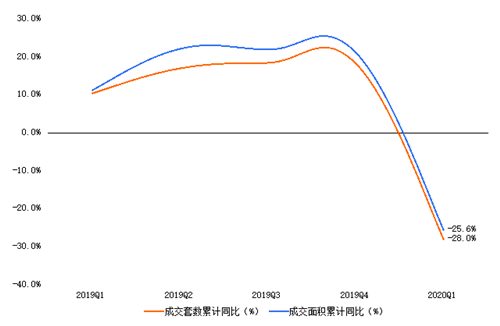 新房市場成交方面,由于售樓處關(guān)閉、停工等動作影響新房線下業(yè)務(wù)開展,2020年一季度66座大中城市中,總體成交套數(shù)與成交面積分別為4247萬㎡、37萬套,累計同比分別下滑28.6%、30.7%,其中一二線城市商品房成交量下降幅度達到3-4成。