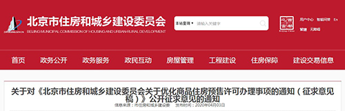 近日,北京市住建委發(fā)布《關(guān)于優(yōu)化商品住房預(yù)售許可辦理事項(xiàng)的通知》的征求意見(jiàn)稿,對(duì)商品住房項(xiàng)目預(yù)售許可截止日期及申請(qǐng)預(yù)售許可的最低規(guī)模要求進(jìn)行了優(yōu)化調(diào)整。