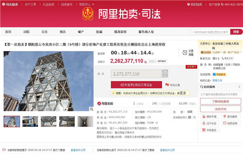 房訊網(wǎng)訊 4月7日10時(shí),中弘股份旗下物業(yè)北京中弘大廈在阿里拍賣平臺(tái)開拍,截至下午15時(shí),已有2人報(bào)名參拍,245人設(shè)置提醒,引起6萬余人次圍觀。此次拍賣將于4月8日10時(shí)截止。