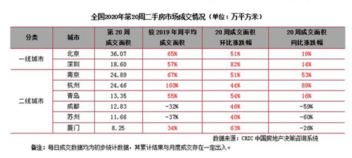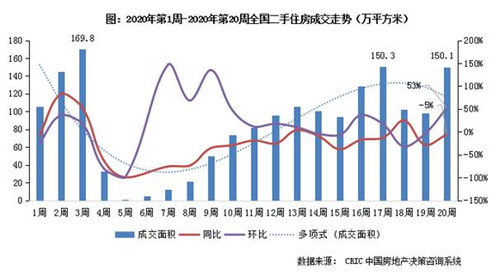 房訊網(wǎng)訊 據(jù)克而瑞地產(chǎn)研究數(shù)據(jù),第20周,8個重點城市二手房成交面積環(huán)比激增53%至150.1萬平方米,且同比跌幅收窄至5%。
