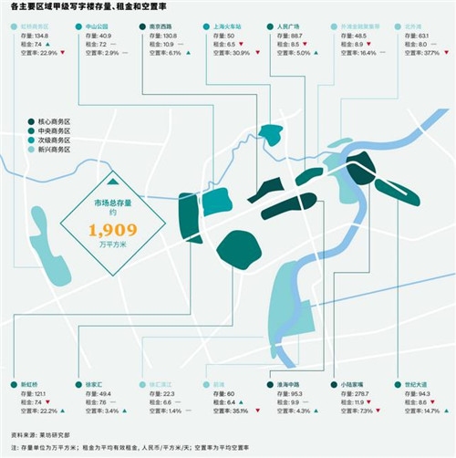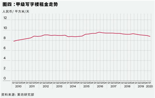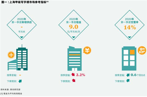 據(jù)萊坊2020年第一季度《上海寫字樓市場報(bào)告》顯示,一季度上海甲級寫字樓市場的平均空置率環(huán)比增加0.6個(gè)百分點(diǎn)至14%,平均租金環(huán)比下跌2.2%至每天每平方米人民幣9.0元。