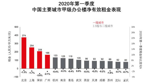 二線城市普遍面臨的市場壓力也較為明顯,尤其是市場剛剛經(jīng)歷了2019年經(jīng)濟(jì)不確定性所帶來的種種變化。本季度由于武漢的租賃活動(dòng)基本停滯,市場租金無變化外,在仲量聯(lián)行跟蹤的其他1.5線及二線城市中,所有城市均錄得一定程度上的租金下跌。