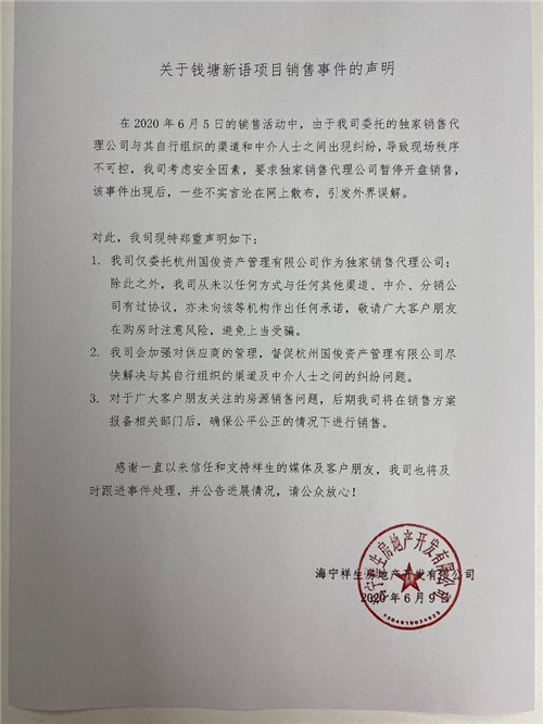 聲明強(qiáng)調(diào),海寧祥生僅委托杭州國(guó)俊資產(chǎn)管理有限公司作為獨(dú)家銷(xiāo)售代理公司,除此之外,從未以任何方式與任何其他渠道、中介、分銷(xiāo)公司有過(guò)協(xié)議,亦未向該等機(jī)構(gòu)作出任何承諾。公司會(huì)加強(qiáng)對(duì)供應(yīng)商的管理,督促杭州國(guó)俊資產(chǎn)管理有限公司盡快解決與其自行組織的渠道及中介人士之間的糾紛問(wèn)題。