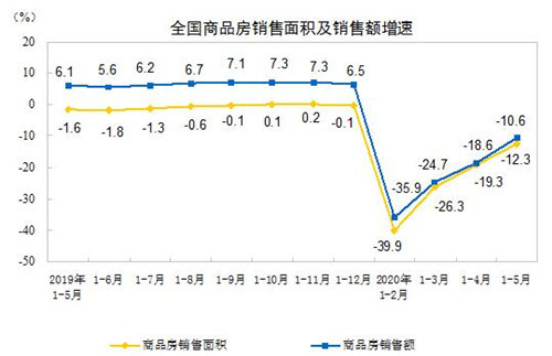 1—5月份,商品房銷售面積48703萬(wàn)平方米,同比下降12.3%,降幅比1—4月份收窄7.0個(gè)百分點(diǎn)。其中,住宅銷售面積下降11.8%,辦公樓銷售面積下降26.7%,商業(yè)營(yíng)業(yè)用房銷售面積下降21.7%。商品房銷售額46269億元,下降10.6%,降幅比1—4月份收窄8.0個(gè)百分點(diǎn)。其中,住宅銷售額下降8.4%,辦公樓銷售額下降35.3%,商業(yè)營(yíng)業(yè)用房銷售額下降26.6%。