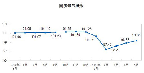 5月份,房地產(chǎn)開發(fā)景氣指數(shù)(簡(jiǎn)稱“國(guó)房景氣指數(shù)”)為99.35,比4月份提高0.49點(diǎn)。