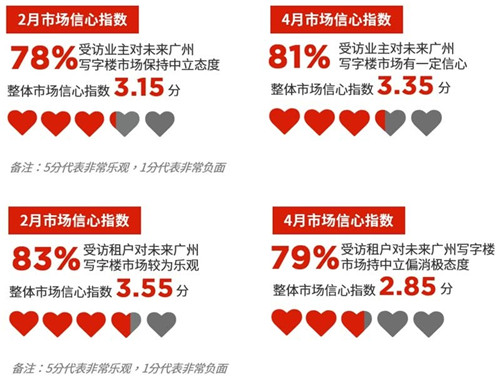 記者獲悉,在疫情防控取得關(guān)鍵進(jìn)展和成果后,戴德梁行在廣州調(diào)研了甲級寫字樓市場85名業(yè)主及132名租戶。調(diào)研顯示逾8成受訪業(yè)主持積極態(tài)度,市場信心指數(shù)波動不大,但受訪租戶由2月逾8成持樂觀態(tài)度,變?yōu)?月近8成持中立偏消極態(tài)度。