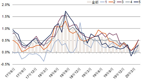 圖2:70個(gè)大中城市新建商品住宅銷售價(jià)格環(huán)比變動(dòng)情況,按城市線級(jí)
