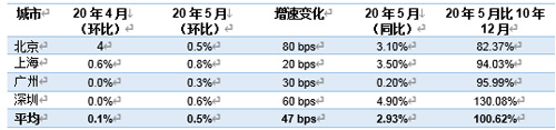 全國70個(gè)大中城市新建住宅價(jià)格指數(shù)在4月份出現(xiàn)反彈后,5月份延續(xù)了上漲趨勢。全國迎來了近十個(gè)月以來均價(jià)上漲城市數(shù)量最多的一個(gè)月,平均售價(jià)在5月環(huán)比上漲0.49%。其中四個(gè)一線城市錄得了顯著上漲:北京變化幅度最大,由4月的環(huán)比下降到5月環(huán)比上漲0.5%;上海則錄得一線城市單月最大漲幅,5月環(huán)比上漲0.8%。