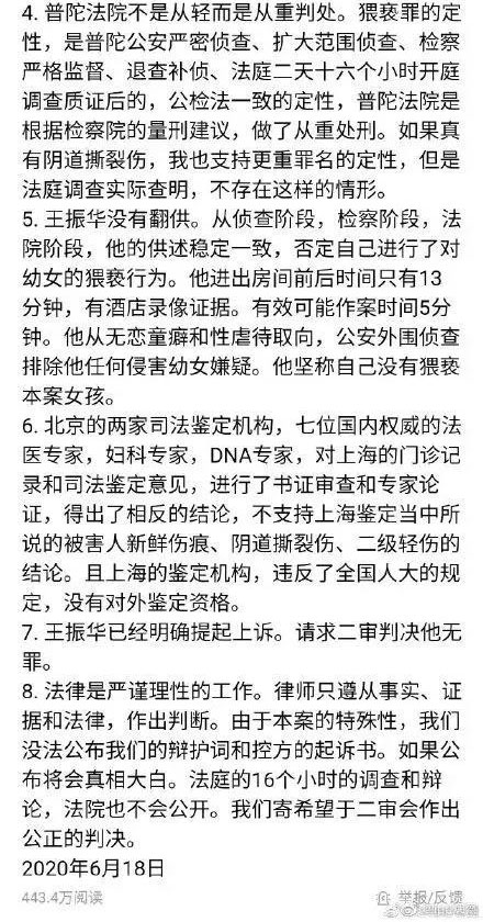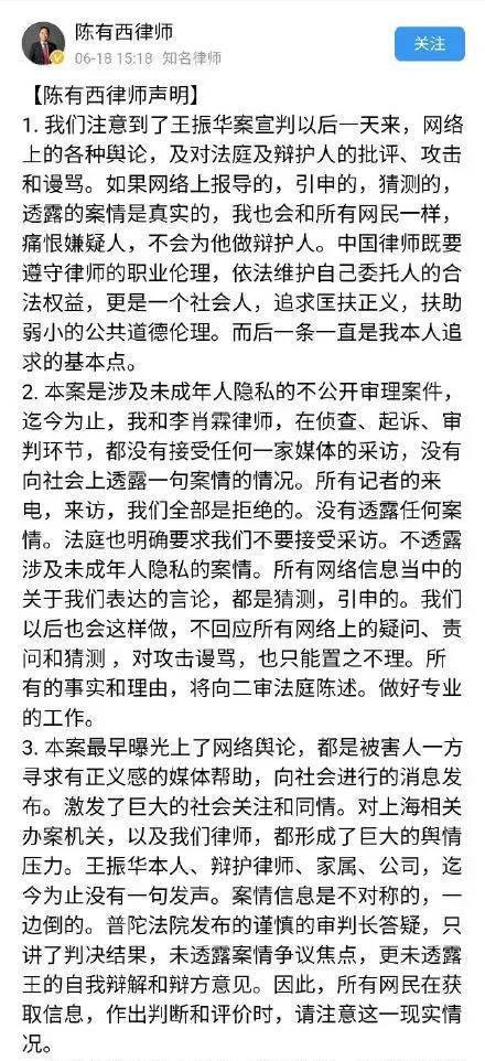 6月18日,王振華辯護(hù)律師陳有西在社交平臺(tái)發(fā)布聲明表示,王振華已經(jīng)明確提起上訴,請(qǐng)求二審判決他無(wú)罪。