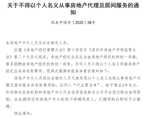 6月23日,深房中協(xié)發(fā)布《關(guān)于不得以個人名義從事房地產(chǎn)代理及居間服務(wù)的通知》(以下簡稱《通知》)!锻ㄖ繁硎,房地產(chǎn)經(jīng)紀(jì)業(yè)務(wù)應(yīng)當(dāng)由房地產(chǎn)經(jīng)紀(jì)機構(gòu)統(tǒng)一承接,服務(wù)報酬由房地產(chǎn)經(jīng)紀(jì)機構(gòu)統(tǒng)一收取。任何人員不得以個人名義承接房地產(chǎn)經(jīng)紀(jì)業(yè)務(wù)并收取費用。