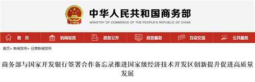 房訊網(wǎng)訊 據(jù)商務(wù)部官網(wǎng)消息,近日,商務(wù)部與國家開發(fā)銀行簽署《關(guān)于推進(jìn)國家級經(jīng)濟(jì)技術(shù)開發(fā)區(qū)創(chuàng)新提升促進(jìn)高質(zhì)量發(fā)展合作備忘錄》,支持國家級經(jīng)濟(jì)技術(shù)開發(fā)區(qū)優(yōu)化產(chǎn)業(yè)布局、拓展城市功能、改善生態(tài)環(huán)境質(zhì)量,提升發(fā)展質(zhì)量和效益。