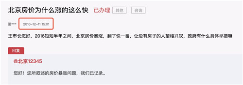 2016年底,一位北京市民在領(lǐng)導(dǎo)留言板上留言,抱怨半年之內(nèi)“房?jī)r(jià)暴漲,翻了快一番”。12345還給了回復(fù),表示“已記錄”。