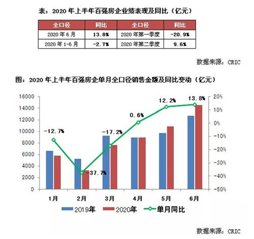 2020年6月,市場熱度持續(xù)、房企去化加速,TOP100房企單月實現(xiàn)全口徑銷售金額14517.2億元,環(huán)比增長33%。單月業(yè)績同比逐月回升,自4月轉(zhuǎn)正后進一步提升至13.8%。
