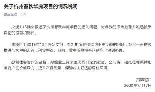 對(duì)此,招商蛇口17日凌晨回應(yīng)稱,該項(xiàng)目于2019年10月開始交付,針對(duì)期間陸續(xù)收到業(yè)主反映的問(wèn)題,項(xiàng)目一直積極推進(jìn)與客戶的溝通,落實(shí)整改。目前,業(yè)主所提報(bào)修問(wèn)題均已得到處理。