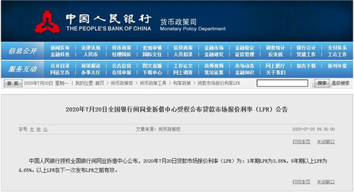 房訊網(wǎng)訊 7月20日,央行公布7月份LPR報價。中國人民銀行授權(quán)全國銀行間同業(yè)拆借中心公布,2020年7月20日貸款市場報價利率(LPR)為:1年期LPR為3.85%,5年期以上LPR為4.65%。至此,LPR與上月持平,并且已連續(xù)四個月維持不變。