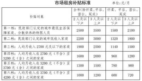 除懷柔、平谷、密云、延慶外的其他區(qū),2人及以下戶(hù)最高補(bǔ)貼標(biāo)準(zhǔn)由1600元提高到2500元,最低補(bǔ)貼標(biāo)準(zhǔn)由200元提高到1000元;3人及以上戶(hù)最高補(bǔ)貼標(biāo)準(zhǔn)由2000元提高到3500元,最低補(bǔ)貼標(biāo)準(zhǔn)由200元提高到1200元,相比之前政策,市場(chǎng)租房補(bǔ)貼標(biāo)準(zhǔn)有大幅提高。