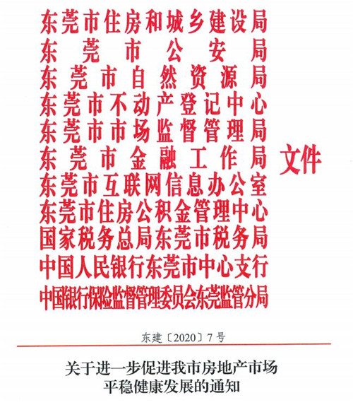 房訊網(wǎng)訊 7月25日,東莞市住房和城鄉(xiāng)建設(shè)局等十一部門聯(lián)合發(fā)布《關(guān)于進(jìn)一步促進(jìn)我市房地產(chǎn)市場平穩(wěn)健康發(fā)展的通知》,自《通知》施行之日起在東莞市行政區(qū)域內(nèi)購買的商品住房(以網(wǎng)簽時間為準(zhǔn),含新建商品住房和二手住房),須取得不動產(chǎn)權(quán)證滿3年后方可交易轉(zhuǎn)讓。