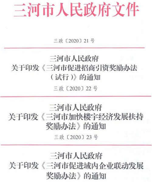 房訊網(wǎng)訊 出臺(tái)《三河市促進(jìn)招商引資獎(jiǎng)勵(lì)辦法(試行)》,打造全方位、多層次寬領(lǐng)域的招商引資新格局;加快樓宇經(jīng)濟(jì)發(fā)展,提升樓宇經(jīng)濟(jì)產(chǎn)業(yè)能級(jí)和集聚效應(yīng);促進(jìn)企業(yè)聯(lián)動(dòng),鼓勵(lì)科技創(chuàng)新,促進(jìn)實(shí)體企業(yè)提質(zhì)增效……