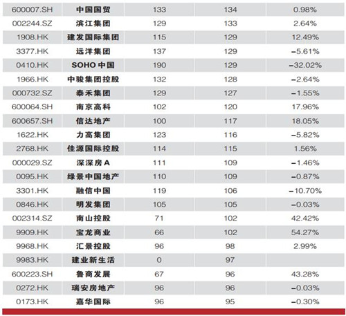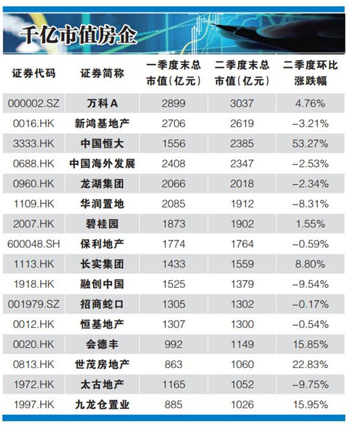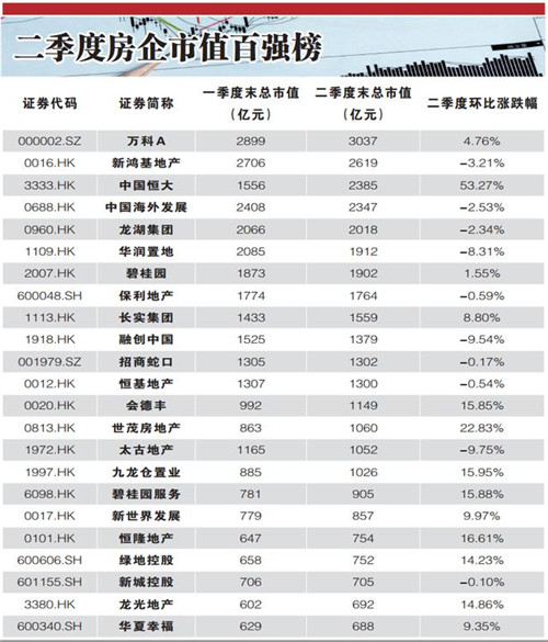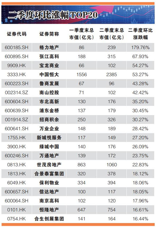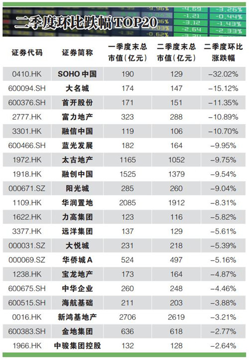 在百強(qiáng)市值房企中,二季度市值漲幅超過50%的有四家企業(yè),分別是格力地產(chǎn)、張江高科、寶龍商業(yè)以及中國恒大;而二季度市值縮水最嚴(yán)重的房企則有SOHO中國、大名城、首開股份、富力地產(chǎn)以及融信中國,跌幅均超過10%。
