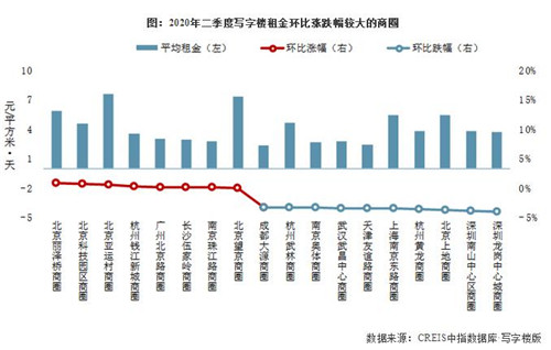 從商圈來看,二季度寫字樓租金環(huán)比上漲的商圈占10.0%,租金環(huán)比下跌的商圈占87.5%,2.5%的商圈租金與上期持平。