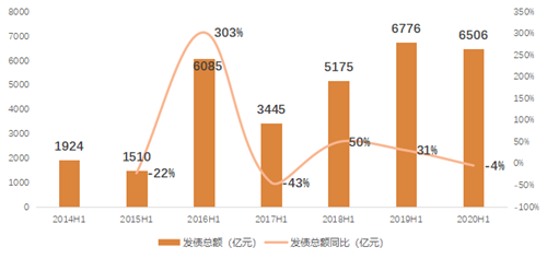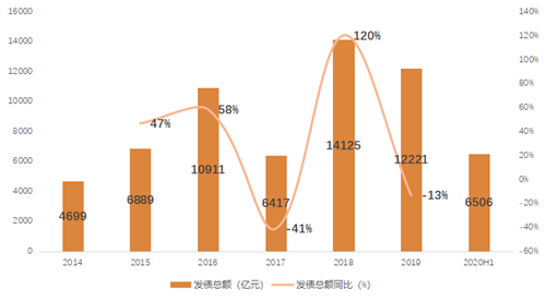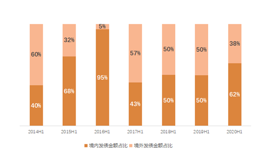 2020年上半年房企境內(nèi)外融資折合人民幣合計(jì)約為6506億,占比2019年全年融資規(guī)模53%。受海外疫情影響,4月全月無新增海外債券,對(duì)整體融資規(guī)模有一定影響,但境內(nèi)債市表現(xiàn)活躍,從而對(duì)沖海外債市的短暫低迷。