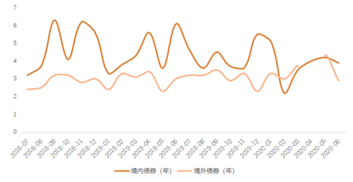 今年上半年整體境內(nèi)外債券期限經(jīng)歷從2月到5月的不斷拉長(zhǎng),6月開始縮短的變化。2月境內(nèi)超短期融資最為活躍,單月融資平均周期僅為2.2年,達(dá)24個(gè)月內(nèi)最低值,也因此被境外融資周期超越;隨著投資人信心逐步恢復(fù),發(fā)債周期也隨機(jī)拉長(zhǎng)。3-5月,5年周期的債券發(fā)行占主要比重,進(jìn)入6月,3年期融資債券占主導(dǎo),整體發(fā)債周期有縮短趨勢(shì)。