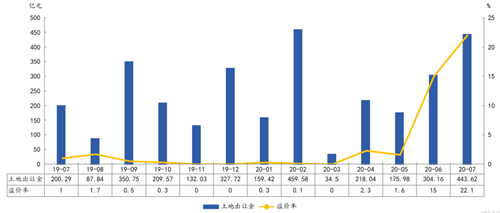 2020年前7月上海土地出讓金及溢價(jià)率走勢(shì) 數(shù)據(jù)來(lái)源:中指研究院