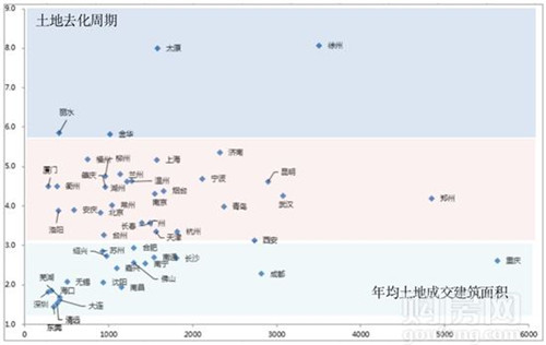 50城市近三年平均土地成交與土地去化周期(單位:萬(wàn)平方米、年)