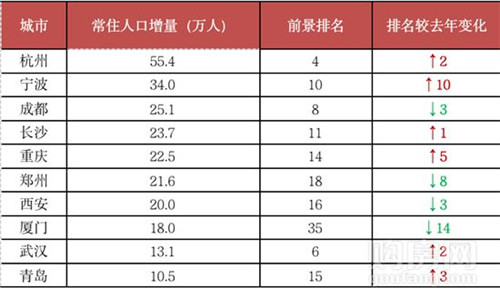 人口增量在TOP15的二線城市譬如杭州、重慶、寧波、合肥、青島等城市的綜合前景排名都有所上升。其中,杭州由于發(fā)達(dá)的互聯(lián)網(wǎng)產(chǎn)業(yè)、良好的環(huán)境,成為這一輪搶人大戰(zhàn)的最佳受益城市之一,2019年常住人口增量居全國(guó)首位。