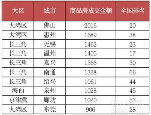 三四線城市中投資前景較好的城市仍然集中在長(zhǎng)三角和大灣區(qū)兩大城市圈。單從2018年商品房成交金額來(lái)看,排名靠前的除泉州和廊坊外,其余均來(lái)自大灣區(qū)和長(zhǎng)三角兩大城市群。其中大灣區(qū)共有3個(gè)城市進(jìn)入前10,分別是佛山、惠州和東莞;長(zhǎng)三角入榜城市最多,共有5個(gè)城市,并且成交金額均超過(guò)了1000億元。