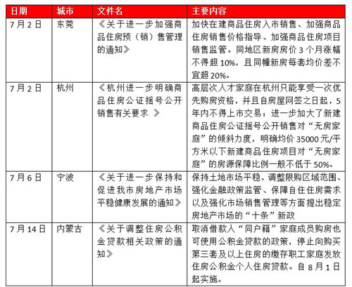 據(jù)不完全統(tǒng)計(jì),今年7月份,包括杭州、東莞、寧波、內(nèi)蒙古、鄭州、深圳、南京等7個(gè)房?jī)r(jià)有所上漲的城市開始出臺(tái)房地產(chǎn)調(diào)控收緊政策。