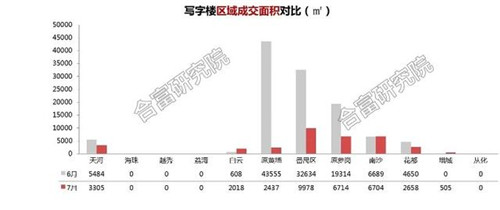 合富大數(shù)據(jù)顯示,7月全市寫(xiě)字樓成交量為34317㎡,同比下降30%,環(huán)比6月份下降60%。寫(xiě)字樓市場(chǎng)成交走勢(shì)相對(duì)于其余業(yè)態(tài)波動(dòng)較大,受大手交易影響的程度較深,7月大手交易的個(gè)案數(shù)及規(guī)模均為中等水平。7月寫(xiě)字樓新增供應(yīng)近3萬(wàn)㎡,主要來(lái)自白云區(qū)的建華廣場(chǎng)及南沙區(qū)的中交匯通中心。