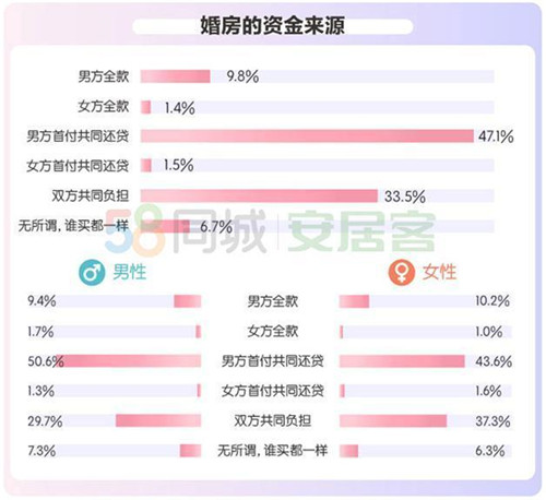 調(diào)查還顯示,有47.1%的人表示婚房是由男方出首付,雙方共同還貸來解決。此外,選擇婚房資金由雙方共同負擔的占比也有33.5%。