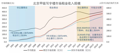 縱觀北京甲級(jí)寫字樓市場發(fā)展的歷史,整體租金收入規(guī)模從2002年的大約30億元左右,增長到2019年的大約420億元,18年間增長大概14倍,預(yù)計(jì)到2023年整體理論市場規(guī)模將達(dá)到500億元。