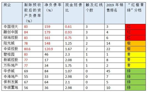 按照華創(chuàng)證券以及申萬宏源研究等機(jī)構(gòu)整理的數(shù)據(jù),12家房企中,恒大、融創(chuàng)、綠地3家房企踩“三道紅線”處紅色檔;陽光城、中梁控股踩“二道紅線”為橙色檔;碧桂園、萬科、新城控股踩“一道紅線”處黃色檔;華僑城、中海、保利、華潤并未踩線處于綠色檔。