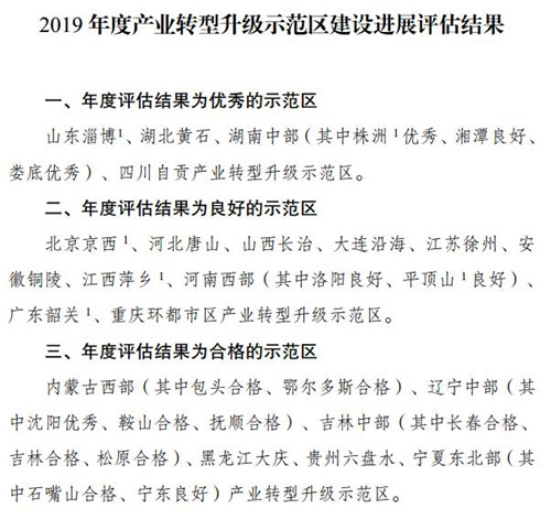 根據(jù)2019年度各示范區(qū)經(jīng)濟社會發(fā)展情況、量化統(tǒng)計數(shù)據(jù)(占80%權(quán)重)和專家組定性評分(占20%權(quán)重),同時根據(jù)有關(guān)要求,對獲得國務院督查激勵的城市在年度評估中給予加分,對年度評估結(jié)果為優(yōu)秀的山東淄博、湖北黃石、湖南中部、四川自貢示范區(qū)予以通報表揚。