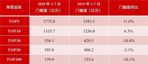 7月31日晚間,多家機(jī)構(gòu)發(fā)布百強(qiáng)房企1~7月銷售業(yè)績(jī)榜,房企銷售業(yè)績(jī)繼續(xù)修復(fù)的同時(shí)出現(xiàn)了陣營(yíng)分化,頭部企業(yè)修復(fù)更快、競(jìng)爭(zhēng)激烈。據(jù)中指院數(shù)據(jù),TOP3以及TOP10房企門檻值較去年同期分別上漲11.6個(gè)、6.3個(gè)百分點(diǎn),但TOP30、TOP50、TOP100房企門檻值較去年同期下降。千億房企陣營(yíng)較1~6月(13家)增加了5家,較去年同期增加3家。