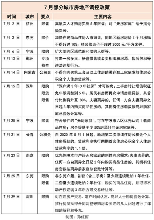 記者梳理發(fā)現(xiàn),7月以來,多個城市圍繞收緊購房資格、限制資金違規(guī)進(jìn)入房地產(chǎn)、支持無房家庭購房、抑制投機(jī)炒房等方面進(jìn)行調(diào)控。