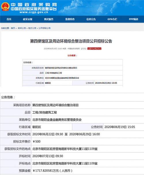 好消息有時會遲到,但不負所期。6-7月,中國政府采購網等多個相關招標網站發(fā)布了關于第四使館區(qū)相關工作的公開招標公告,涉及使館區(qū)邊界圍墻、電氣工程、綠化工程、土建工程等,開啟了備受矚目的北京第四使館區(qū)建設序章。