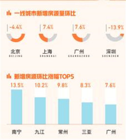 市場供應方面,報告顯示全國新增掛牌房源量環(huán)比下跌4.8%。一線城市北京和深圳出現(xiàn)一定程度的環(huán)比下跌情況,其中深圳新增掛牌房源量環(huán)比下降最為明顯,為-13.9%;上海和廣州新增掛牌房源量環(huán)比上漲均超過7%。從全國范圍來看,南寧、九江、常州、三亞和廣東環(huán)比上漲形勢備受矚目,其中南寧以13.5%的環(huán)比漲幅排名最高。