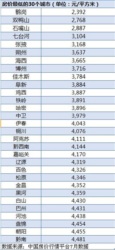 根據(jù)中國房價行情平臺7月數(shù)據(jù),目前共有30個地市州房價低于每平方米4500元,共有14個城市低于每平方米4000元。其中,最低的10個地市州分別是鶴崗、雙鴨山、石嘴山、七臺河、張掖、朔州、海西、博州、佳木斯、阜新。