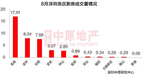 從各區(qū)新房住宅成交面積來(lái)看,8月龍崗以17.01萬(wàn)平的成交量位居第一,占全市成交的41.6%;龍華成交面積為8.04萬(wàn)平,占全市成交的19.70%,位居第二;光明新區(qū)成交7.66萬(wàn)平,占比18.7%,位居第三。不過(guò),羅湖區(qū)連續(xù)兩月零成交。