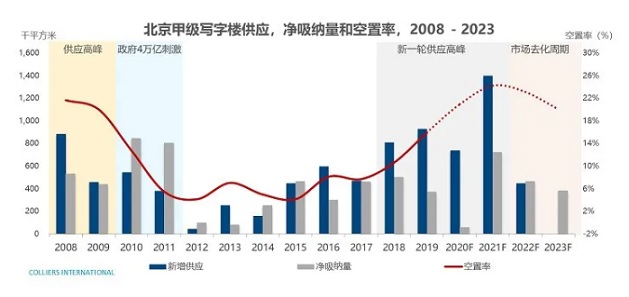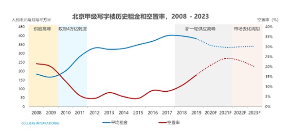 對于2020年全年的預測,高力國際依然延續(xù)市場處于三期疊加的判斷,依然維持宏觀經(jīng)濟增長穩(wěn)步復蘇,北京疫情防控有效和寫字樓需求中性釋放的三個宏觀基礎條件,并預計供需失衡的態(tài)勢仍會加劇并會延續(xù)到2021年,以及空置率明年觸頂?shù)难信。在四季度,若新項目如期入市,整體市場單季度新增供應將接近50萬平方米,空置率大概率突破20%。2021年的新增供應將接近140萬平方米,剔除自用的影響,對市場的沖擊大概在110萬平方米。因此,在未來的15個月,北京將迎來近200萬平方米的新增供應,因此我們預計北京的空置率將在2021年觸及最高點,達到接近25%的水平。CBD核心區(qū)的中服地塊和麗澤區(qū)域的新項目預計將在明年全部入市,2021年將是北京第二輪高供應期的最后一年。在需求端,我們預計四季度會延續(xù)三季度持續(xù)回暖的態(tài)勢,但全年凈吸納量創(chuàng)有歷史記錄以來的新低已經(jīng)幾乎沒有任何懸念。