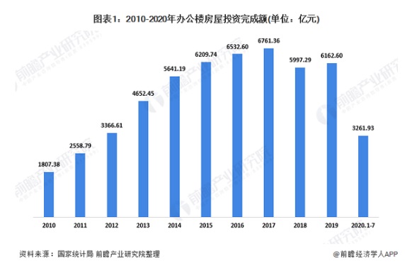 2010-2017年我國辦公樓投資完成額逐年上升,2017年達到近年來的最高值6761.36億元,隨后投資額有所下降。2019年我國辦公樓完成投資額6162.60億元,同比增長2.76%。