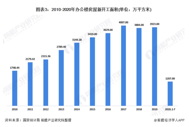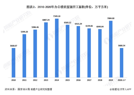 2010-2014年我國辦公樓新開工面積呈上升趨勢,2014年達到7349.10萬平方米,為近年來的最高值。2015-2018年辦公樓新開工面積逐年下降,2019年新開工面積回升到7084萬平方米,同比增長17.11%。